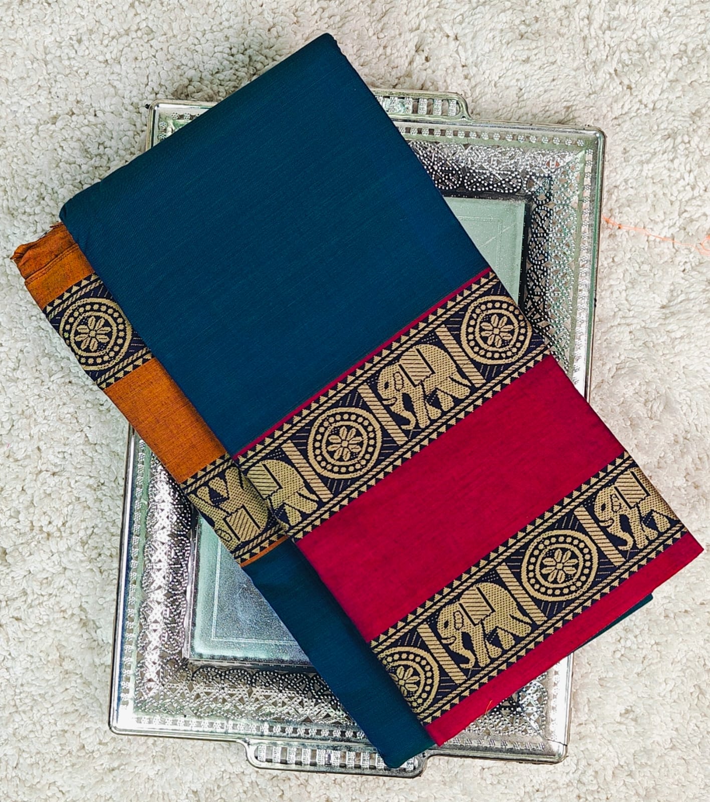 - Color: Vibrant traditional shades with Contrast Elegant Border